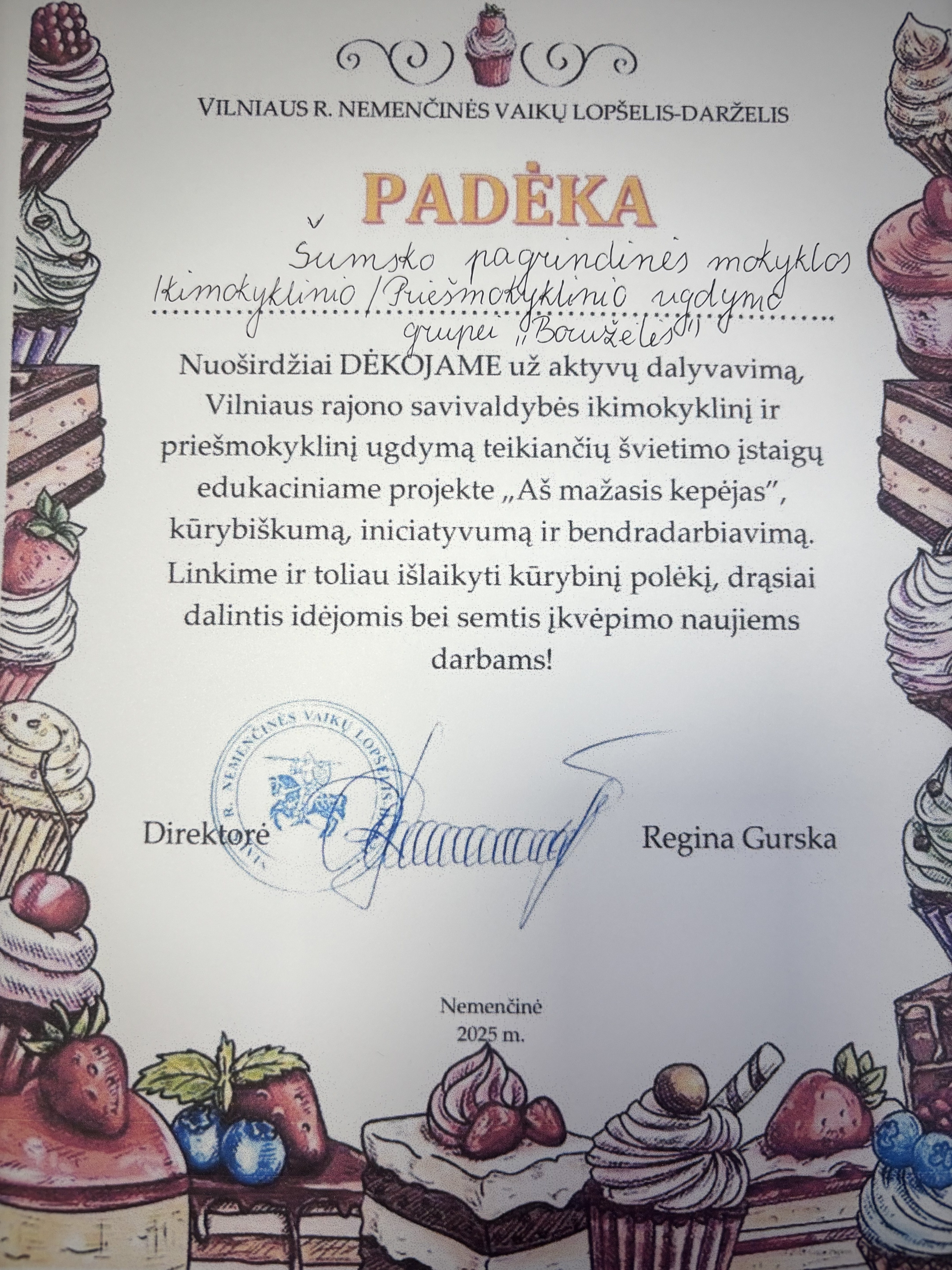 Ikimokyklinio ir priešmokyklinio ugdymo grupė „Boružėlės“ vaikai dalyvavo projekte „Aš mažasis kepėjas“. 👩‍🍳🧑‍🍳Projekto metu vaikai susipažino su kepėjo profesija, įvairiais kepiniams naudojamais ingredientais bei mokėsi saugaus ir higieniško elgesio virtuvėje. Projektas suteikė daug teigiamų emocijų ir džiugių patirčių.😊