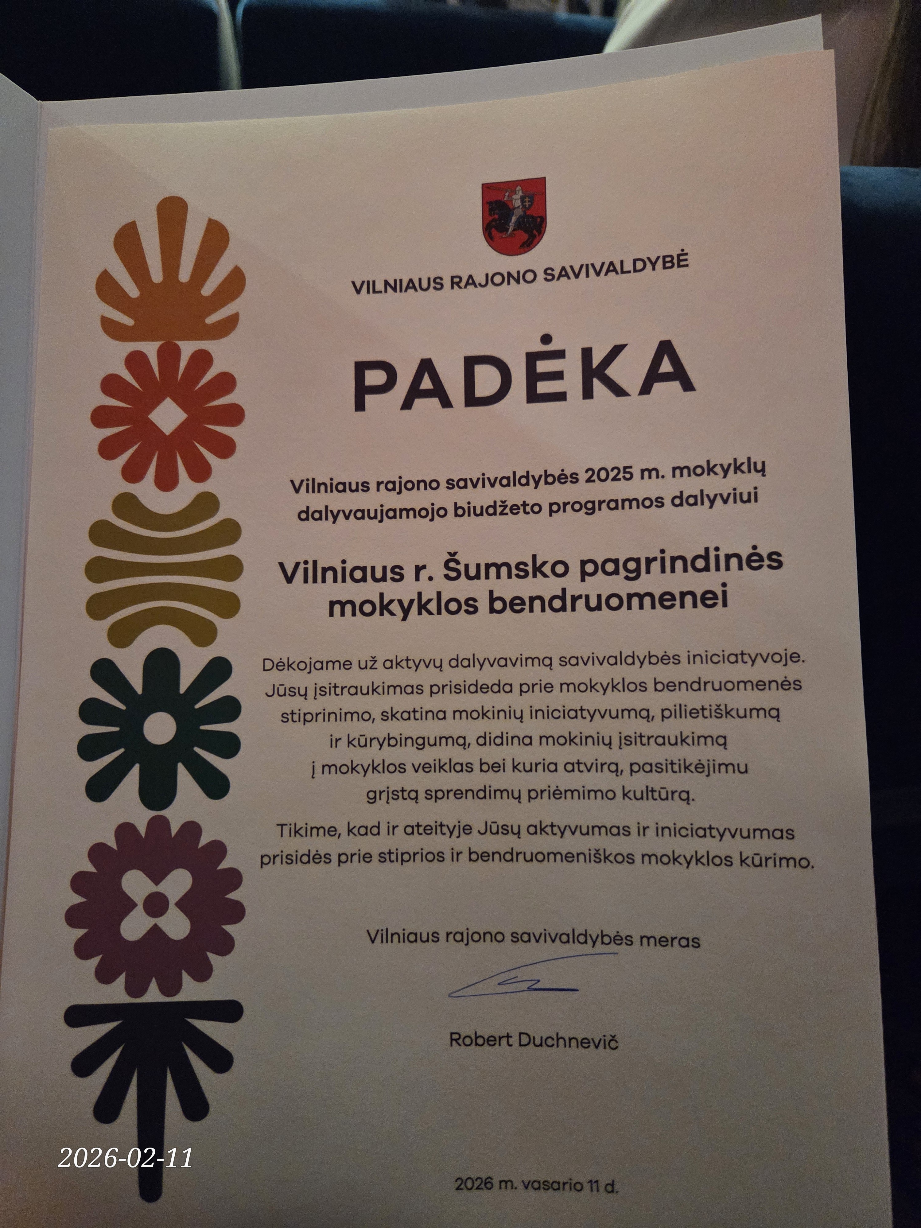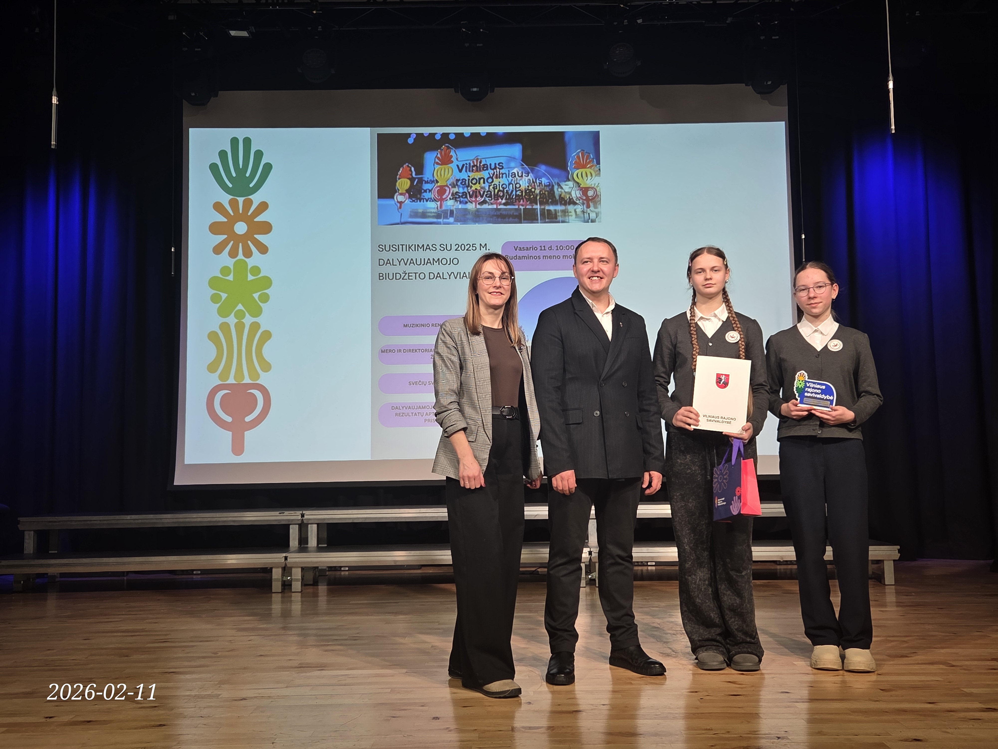 Vasario 11 d. 8 klasės mokinės Živilė Žydelytė ir Uljana Chrebtova kartu su ekonomikos ir verslumo mokytoja Inesa Korvel dalyvavo Vilniaus rajono savivaldybės Dalyvaujamojo biudžeto iniciatyvos renginyje. Renginio metu dalyviai susipažino su jau įgyvendintais projektais, išgirdo daug naudingos ir įkvepiančios informacijos apie iniciatyvos galimybes bei jos teikiamą naudą bendruomenei. Šventinę nuotaiką sustiprino Vilniaus rajono savivaldybės mero įteikta padėka mokyklai už aktyvų dalyvavimą projekte. Džiaugiamės, kad mūsų mokykla šioje iniciatyvoje dalyvauja jau nuo 2023 metų ir nuosekliai prisideda prie prasmingų idėjų įgyvendinimo.